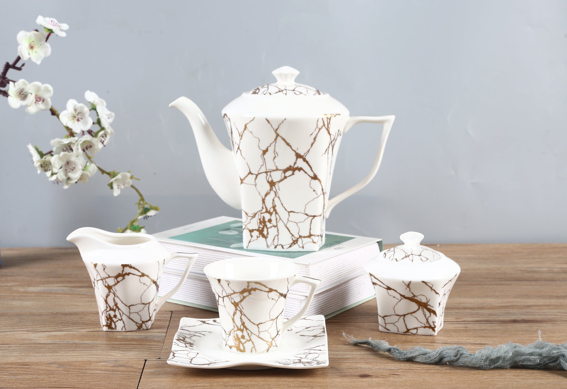 This RoyalDine Exclusive 15 Pieces Coffee/Tea Set is a must-have for tea lovers. Made of high-quality ceramic material, this exquisite tea set features a beautiful marble design in vintage black and white colors. The set includes everything you need to serve tea in style, including a teapot, cups, saucers, and a sugar and creamer set. Perfect for entertaining guests or enjoying a relaxing cup of tea at home. The elegant design and durable construction make this tea set a great addition to any kitchen or dining room.